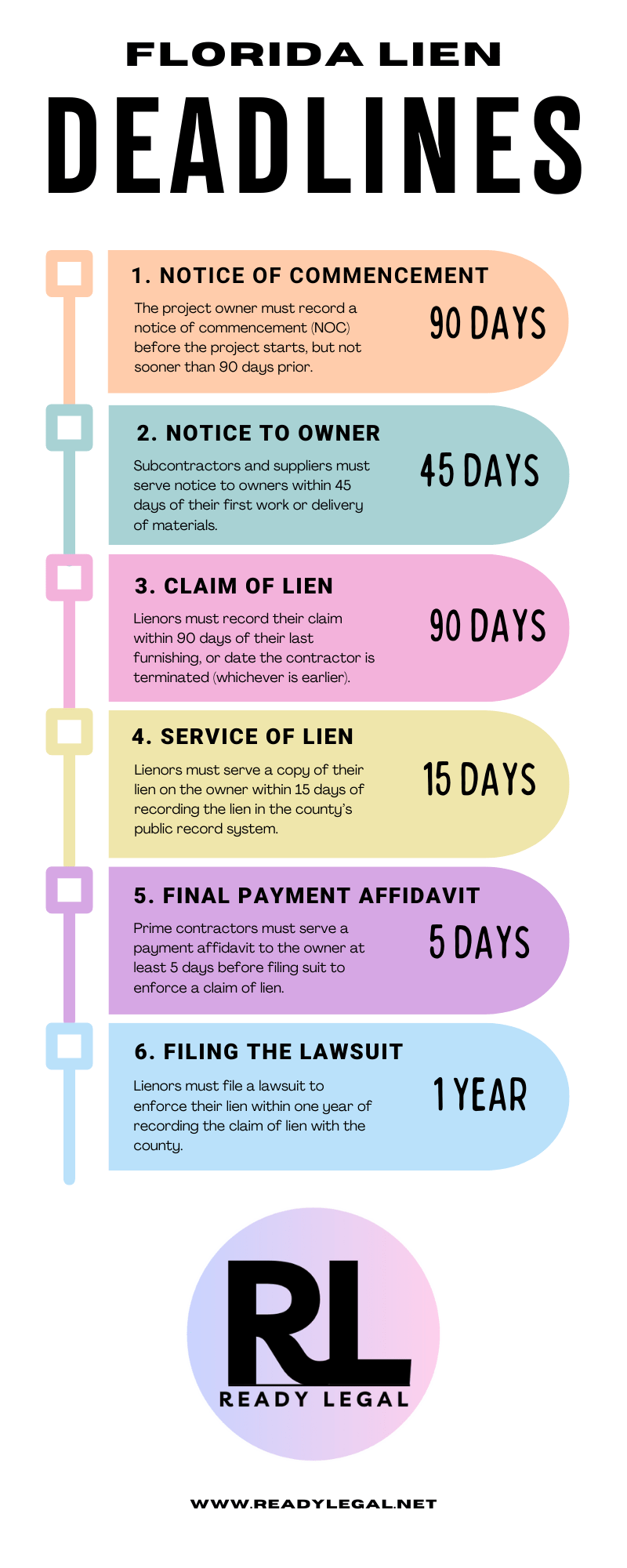 Navigating the intricacies of Florida’s Construction Lien Law is essential for all stakeholders involved in construction projects. By understanding and adhering to these six crucial deadlines, property owners, contractors, and subcontractors can mitigate risks, maintain transparency, and ensure a fair resolution of payment disputes.