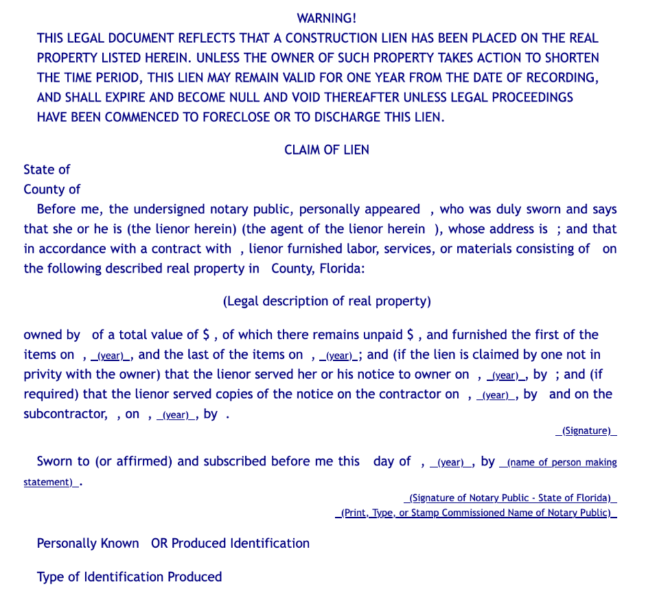 Florida law prescribes the form and substance that a claim of lien must adhere to. All lien claims in Florida must be in substantially the following form: